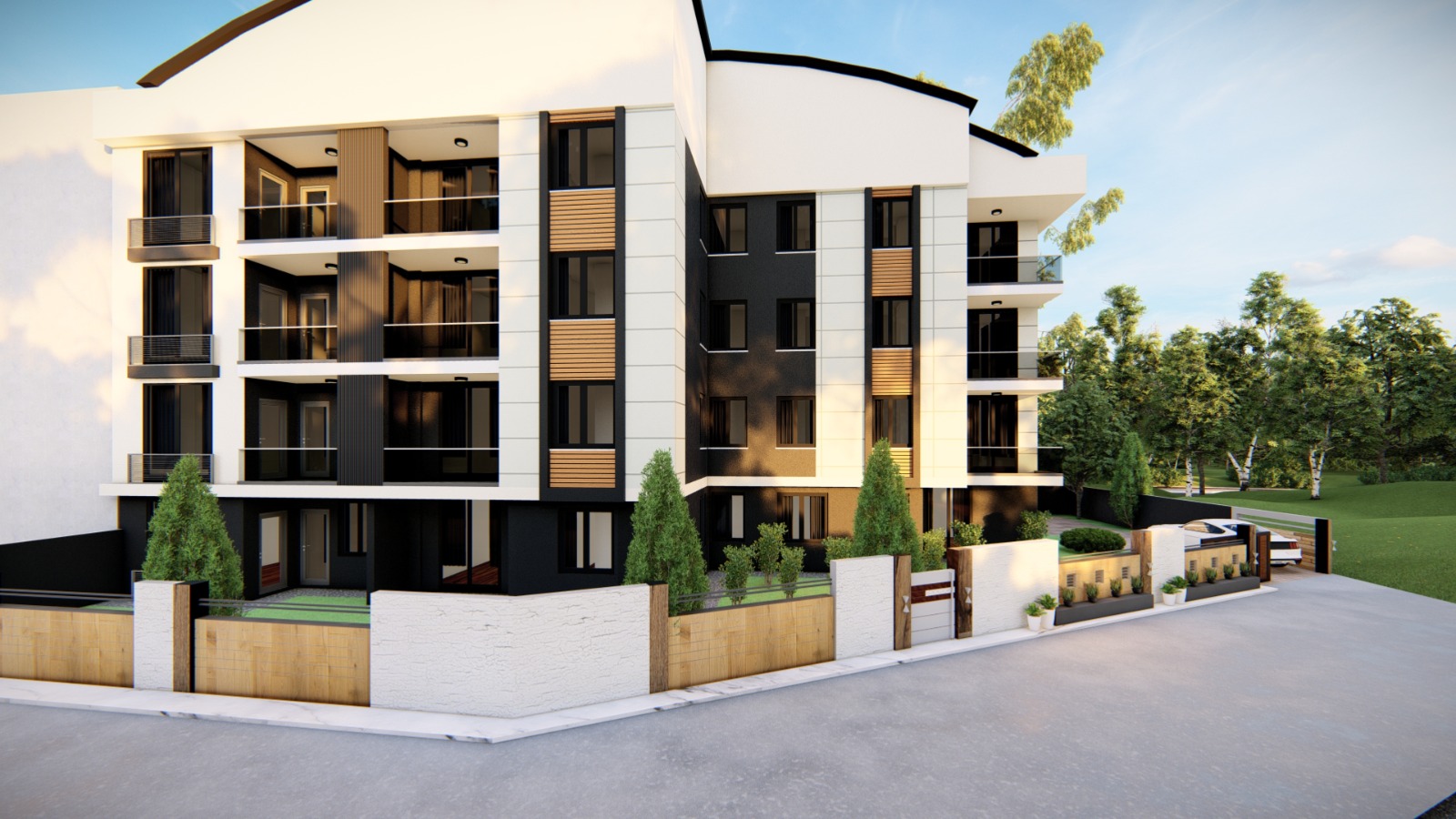 Projemizin dış cephesinde tercih ettiğimiz ritmik dokular ve geniş pencere açıklıkları, yapının modern karakterini vurgularken çevresindeki kentsel silüetle de nazik bir uyum yakalıyor. 3 ve 5 katlı blokların getirdiği alçak gönüllü ölçek, iç mekanlarda sunduğumuz yüksek tavanlar ve ferah kat planlarıyla birleşerek, kullanıcılarına “nefes alan” daireler sunuyor. Her dairenin gün ışığından optimum düzeyde yararlanması ve doğal havalandırma standartlarının en üst seviyede tutulması, tasarım sürecimizdeki öncelikli kriterlerimiz oldu.